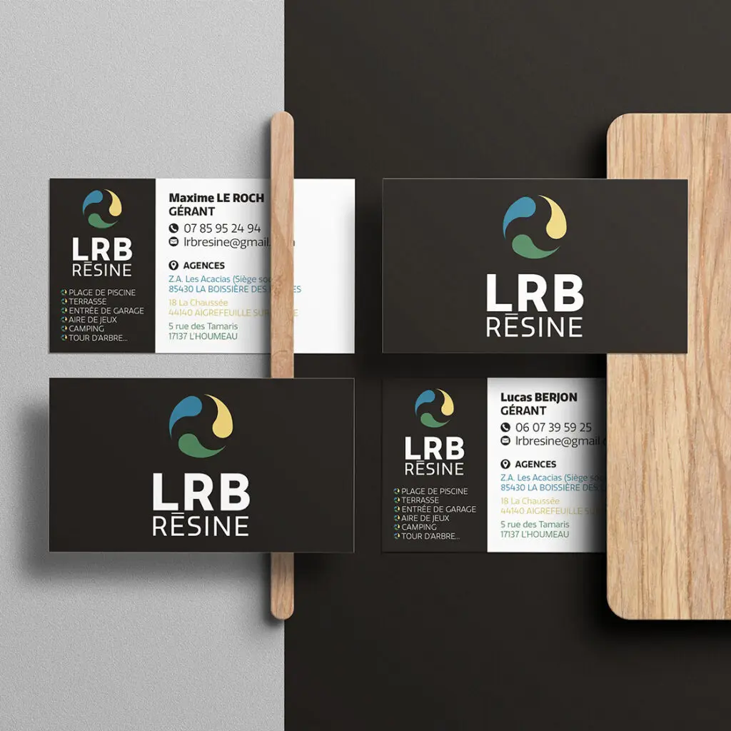 Maxime et Lucas ont créé la société LRB qui réalise des aménagements extérieurs, plages de piscines, terrasses, allées, etc. avec de la résine drainante. J’ai eu le plaisir de réaliser leur logo, sa charte graphique et leurs cartes de visite.