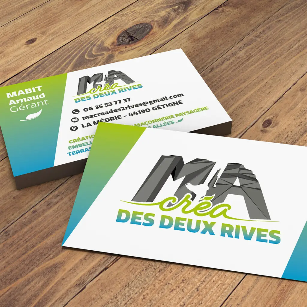 L'entreprise "Ma créa des deux rives" réalise des aménagements paysagers. J'ai eu le plaisir de réaliser leur logo, la charte graphique, les cartes de visite et le covering de leur véhicule.